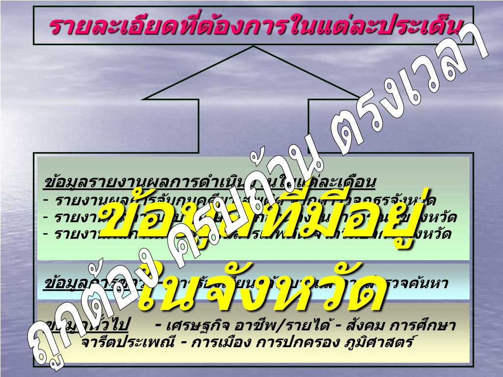 รายละเอียดที่ต้องการในแต่ละประเด็นรายละเอียดที่ต้องการในแต่ละประเด็น • ข้อมูลรายงานผลการดำเนินงานในแต่ละเดือน • รายงานผลการจับกุมคดียาเสพติด จากตำรวจภูธรจังหวัด • รายงานผลการบำบัดรักษา จากสำนักงานสาธารณสุขจังหวัด • รายงานผลการตรวจพิสูจน์สารเสพติด จากวิทยาการจังหวัด ถูกต้อง ครบถ้วน ตรงเวลา ข้อมูลที่มีอยู่ ในจังหวัด ข้อมูลการข่าว - การร้องเรียนแจ้งเบาะแส การสำรวจค้นหา ข้อมูลทั่วไป - เศรษฐกิจ อาชีพ/รายได้ - สังคม การศึกษา จารีตประเพณี - การเมือง การปกครอง ภูมิศาสตร์
