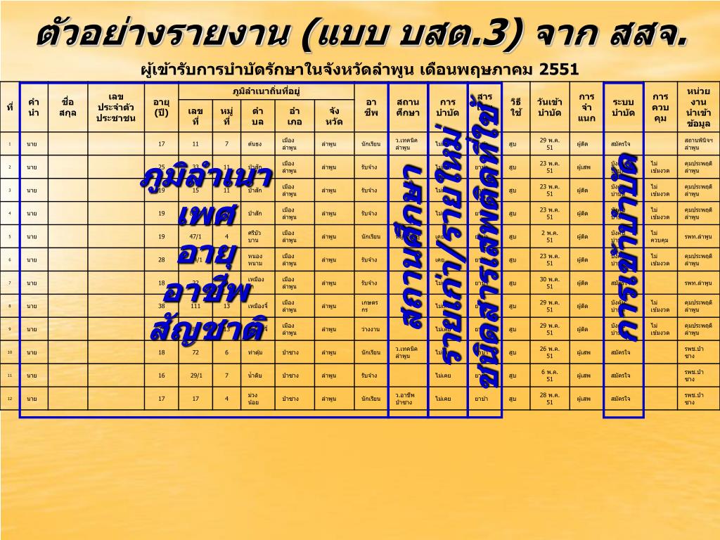 ตัวอย่างรายงาน (แบบ บสต.3) จาก สสจ. ภูมิลำเนา เพศ อายุ อาชีพ สัญชาติ รายเก่า/รายใหม่ สถานศึกษา การเข้าบำบัด ชนิดสารเสพติดที่ใช้