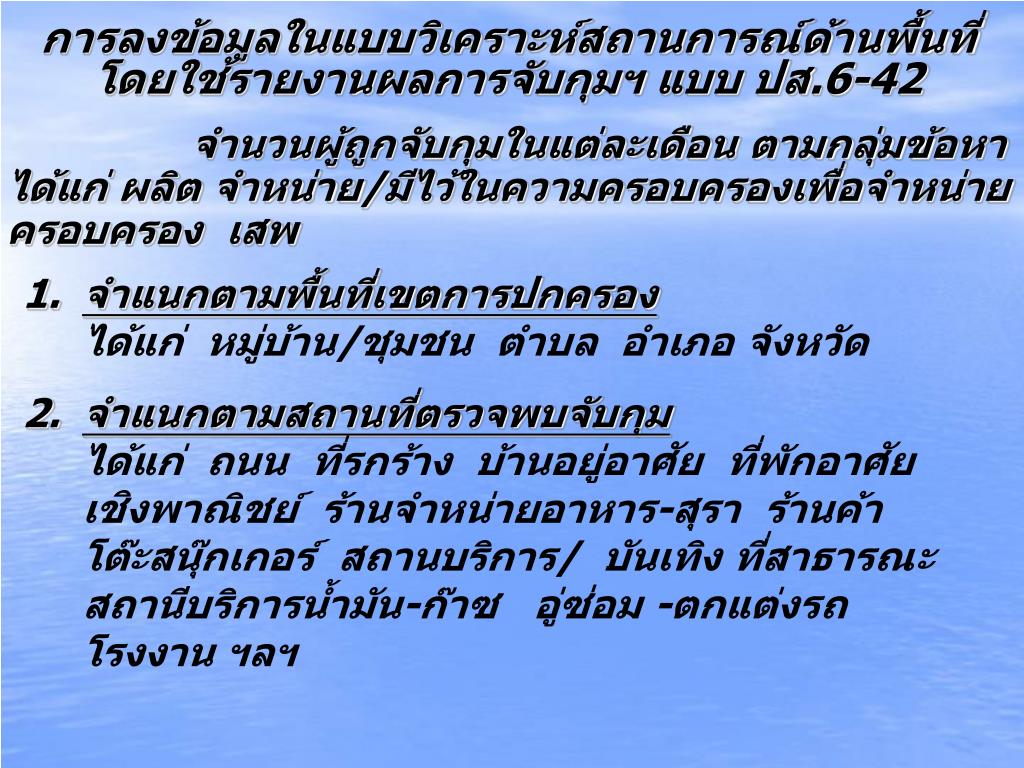 การลงข้อมูลในแบบวิเคราะห์สถานการณ์ด้านพื้นที่การลงข้อมูลในแบบวิเคราะห์สถานการณ์ด้านพื้นที่ โดยใช้รายงานผลการจับกุมฯแบบ ปส.6-42 จำนวนผู้ถูกจับกุมในแต่ละเดือน ตามกลุ่มข้อหา ได้แก่ ผลิต จำหน่าย/มีไว้ในความครอบครองเพื่อจำหน่าย ครอบครอง เสพ • จำแนกตามพื้นที่เขตการปกครอง ได้แก่ หมู่บ้าน/ชุมชน ตำบล อำเภอ จังหวัด • จำแนกตามสถานที่ตรวจพบจับกุม ได้แก่ ถนน ที่รกร้าง บ้านอยู่อาศัย ที่พักอาศัย เชิงพาณิชย์ ร้านจำหน่ายอาหาร-สุรา ร้านค้า โต๊ะสนุ๊กเกอร์ สถานบริการ/ บันเทิง ที่สาธารณะ สถานีบริการน้ำมัน-ก๊าซ อู่ซ่อม -ตกแต่งรถ โรงงาน ฯลฯ