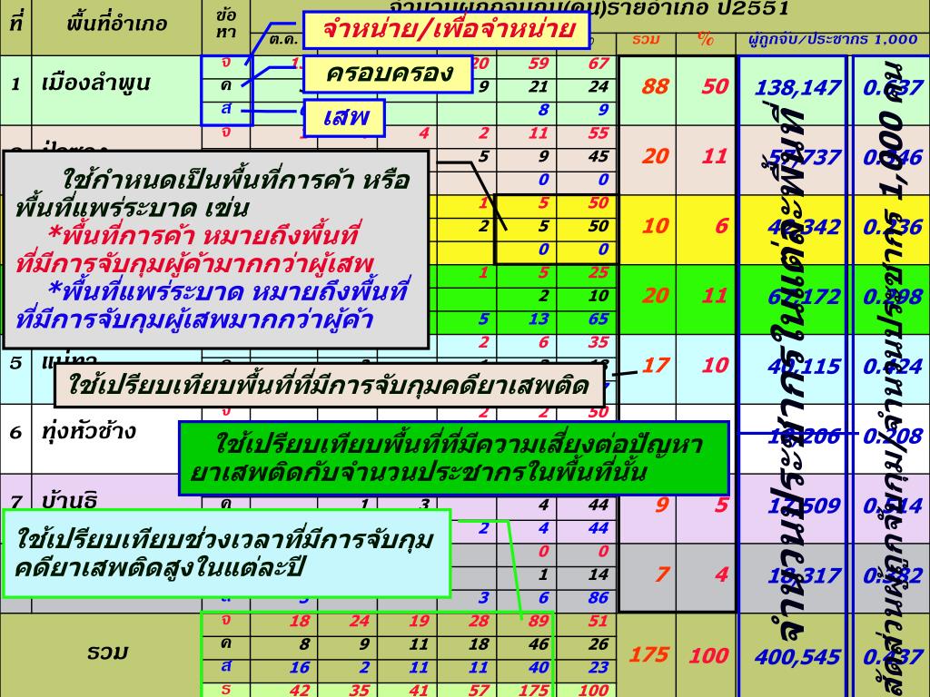 ตัวอย่างการใช้กราฟสถิตินำเสนอผลการวิเคราะห์พื้นที่การค้าหรือแพร่ระบาดตัวอย่างการใช้กราฟสถิตินำเสนอผลการวิเคราะห์พื้นที่การค้าหรือแพร่ระบาด พื้นที่การค้า(ผู้ค้ามากกว่าผู้เสพ) ได้แก่ อำเภอเมือง ป่าซาง บ้านโฮ่ง ทุ่งหัวช้าง พื้นที่แพร่ระบาด (ผู้เสพ มากกว่าผู้ค้า) ได้แก่ อำเภอลี้ แม่ทา เวียงหนองล่อง บ้านธิ