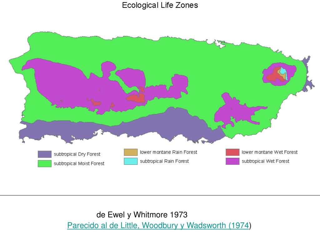 Ecogeografía de Puerto Rico. Historia de la descripción ecológica de PR. Ningún intento conocido antes del siglo XX, pero… Gleason y Cook 1927 (esquema sucesional) Dansereau 1966 (edafoclimático) Ewel y Whitmore 1973 (bioclimático) Little, Woodbury y Wadsworth 1974 (edafoclimático)