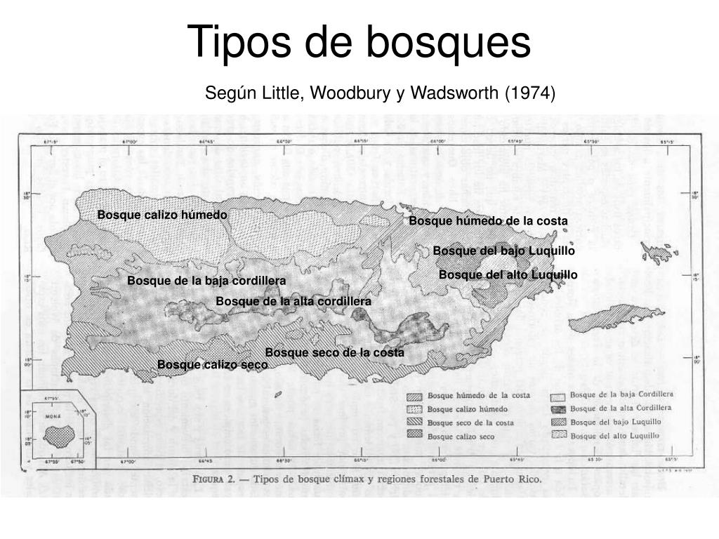Tipos de bosques Según Little, Woodbury y Wadsworth (1974) Bosque calizo húmedo Bosque húmedo de la costa Bosque del bajo Luquillo Bosque del alto Luquillo Bosque de la baja cordillera Bosque de la alta cordillera Bosque seco de la costa Bosque calizo seco