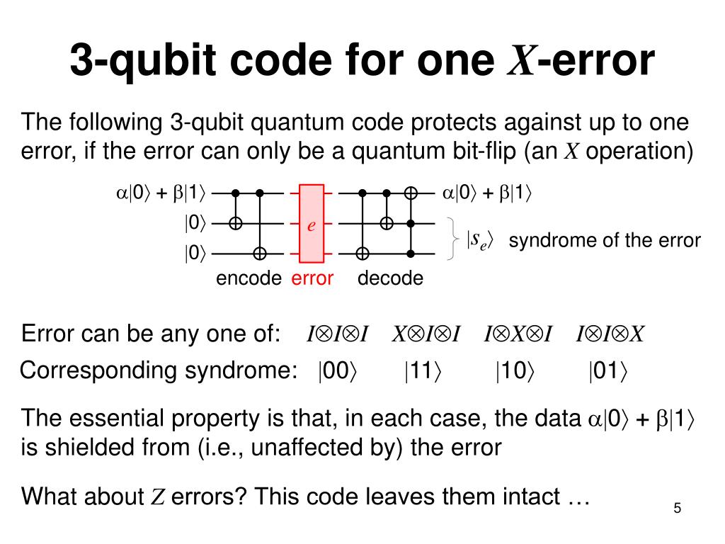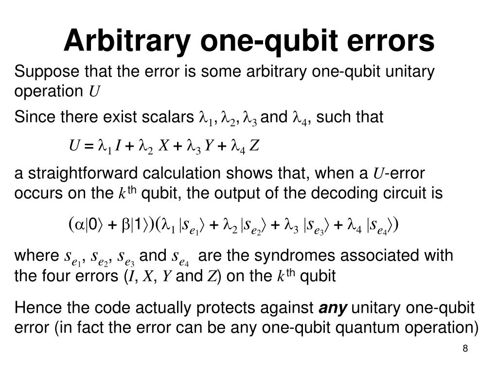 Arbitrary one-qubit errors Suppose that the error is some arbitrary one-qubit unitary operation U Since there exist scalars 1,2,3 and 4, such that U =1 I +2 X +3 Y +4Z a straightforward calculation shows that, when a U-error occurs on the kth qubit, the output of the decoding circuit is (0+ 1)(1 se1 +2 se2 +3 se3 +4 se4) where se1,se2, se3and se4 are the syndromes associated with the four errors (I, X, Y and Z)on the kth qubit Hence the code actually protects against any unitary one-qubit error (in fact the error can be any one-qubit quantum operation)