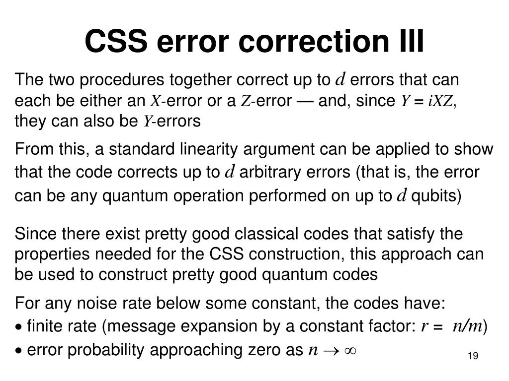 CSS error correction III The two procedures together correct up to d errors that can each be either an X-error or a Z-error — and, since Y=iXZ, they can also be Y-errors From this, a standard linearity argument can be applied to show that the code corrects up to d arbitrary errors (that is, the error can be any quantum operation performed on up to d qubits) Since there exist pretty good classical codes that satisfy the properties needed for the CSS construction, this approach can be used to construct pretty good quantum codes For any noise rate below some constant, the codes have: finite rate (message expansion by a constant factor: r = n/m) error probability approaching zero as n