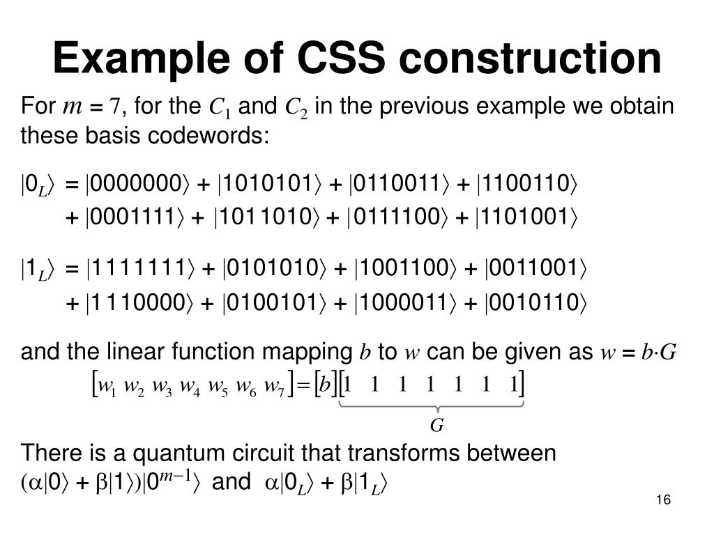 Example of CSS construction For m = 7, for the C1and C2in the previous example we obtain these basis codewords: 0L =0000000+1010101+ 0110011+ 1100110 +0001111 +1011010 +0111100+ 1101001 1L =1111111+0101010+1001100+0011001 +1110000+0100101+1000011+0010110 and the linear function mapping b to w can be given as w = bG G There is a quantum circuit that transforms between(0+ 1)0m1 and 0L+ 1L