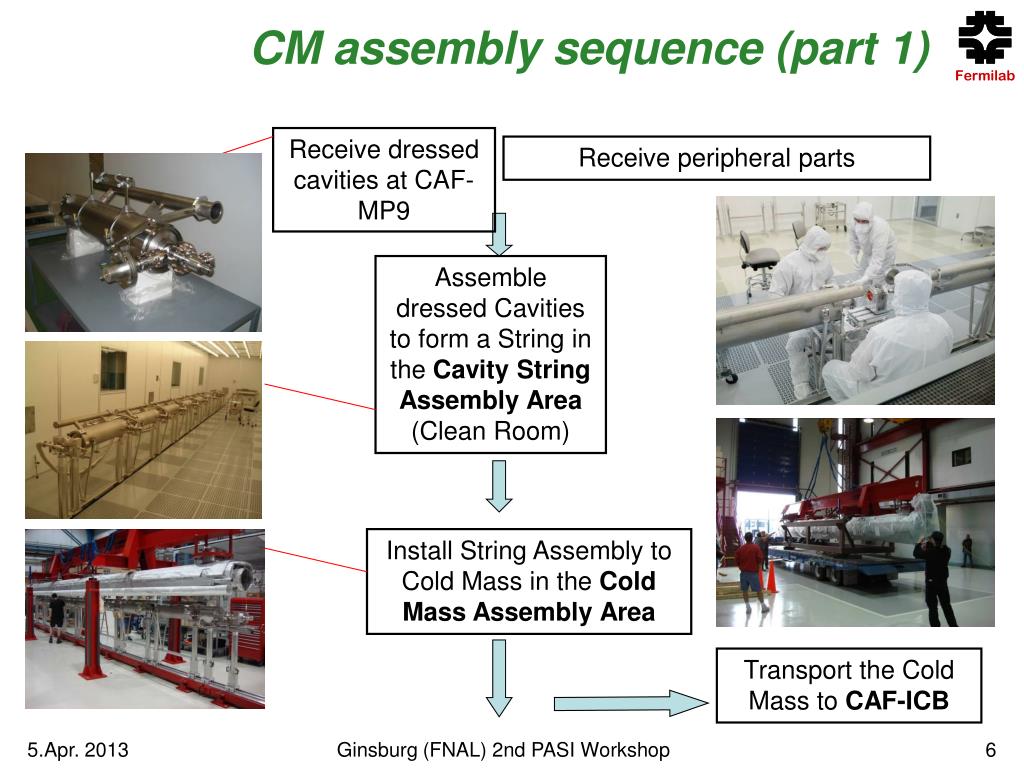 CM assembly sequence (part 1) Receive dressed cavities at CAF-MP9 Receive peripheral parts Assemble dressed Cavities to form a String in the Cavity String Assembly Area (Clean Room) Install String Assembly to Cold Mass in the Cold Mass Assembly Area Transport the Cold Mass to CAF-ICB Ginsburg (FNAL) 2nd PASI Workshop