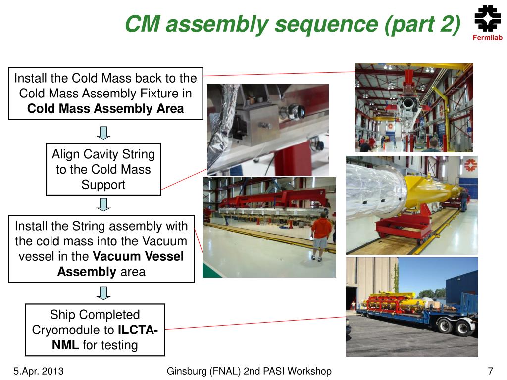CM assembly sequence (part 2) Install the Cold Mass back to the Cold Mass Assembly Fixture in Cold Mass Assembly Area Align Cavity String to the Cold Mass Support Install the String assembly with the cold mass into the Vacuum vessel in the Vacuum Vessel Assembly area Ship Completed Cryomodule to ILCTA-NML for testing Ginsburg (FNAL) 2nd PASI Workshop