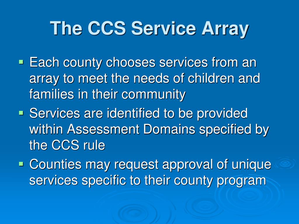 The CCS Service Array • Each county chooses services from an array to meet the needs of children and families in their community • Services are identified to be provided within Assessment Domains specified by the CCS rule • Counties may request approval of unique services specific to their county program