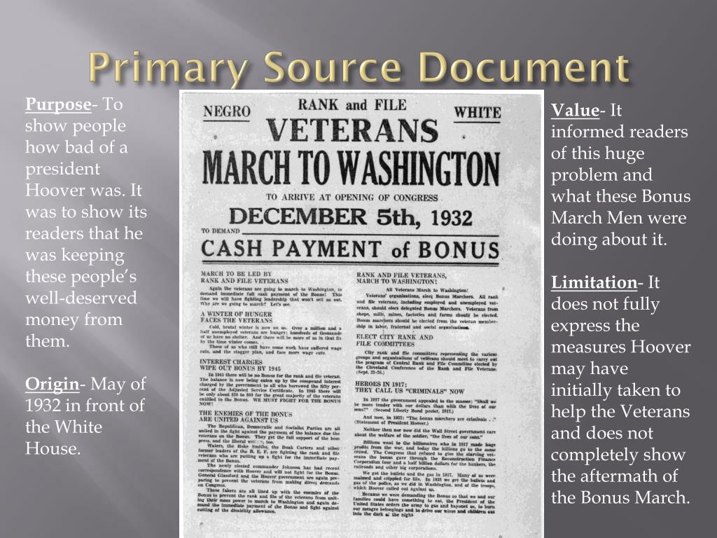 Primary Source Document Purpose- To show people how bad of a president Hoover was. It was to show its readers that he was keeping these people’s well-deserved money from them. Origin- May of 1932 in front of the White House. Value- It informed readers of this huge problem and what these Bonus March Men were doing about it. Limitation- It does not fully express the measures Hoover may have initially taken to help the Veterans and does not completely show the aftermath of the Bonus March.