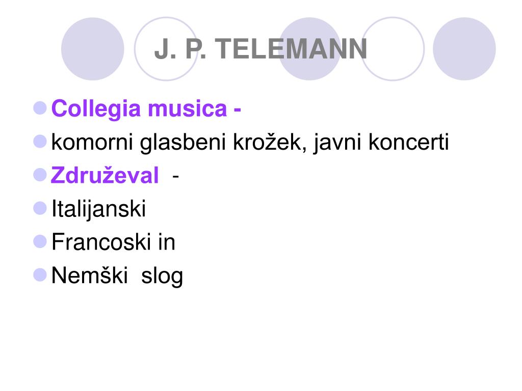 J. P. TELEMANN • Collegia musica - • komorni glasbeni krožek, javni koncerti • Združeval - • Italijanski • Francoski in • Nemški slog