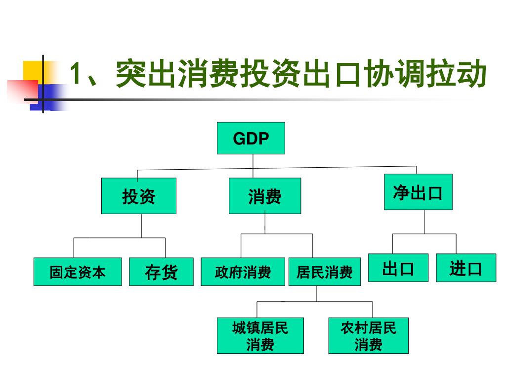 1、突出消费投资出口协调拉动 GDP 净出口 投资 消费 出口 进口 固定资本 存货 政府消费 居民消费 城镇居民 消费 农村居民 消费