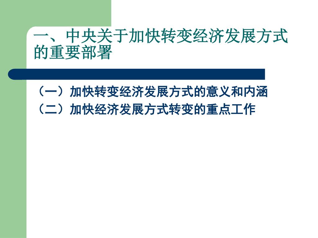 一、中央关于加快转变经济发展方式的重要部署一、中央关于加快转变经济发展方式的重要部署 (一)加快转变经济发展方式的意义和内涵 (二)加快经济发展方式转变的重点工作