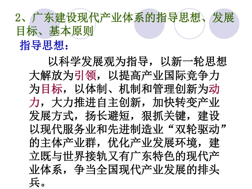 2、广东建设现代产业体系的指导思想、发展目标、基本原则2、广东建设现代产业体系的指导思想、发展目标、基本原则 指导思想: 以科学发展观为指导,以新一轮思想大解放为引领,以提高产业国际竞争力为目标,以体制、机制和管理创新为动力,大力推进自主创新,加快转变产业发展方式,扬长避短,狠抓关键,建设以现代服务业和先进制造业“双轮驱动”的主体产业群,优化产业发展环境,建立既与世界接轨又有广东特色的现代产业体系,争当全国现代产业发展的排头兵。