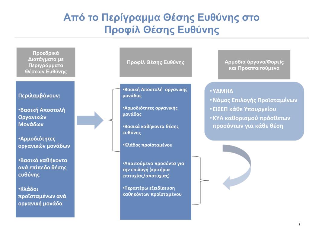 Από το Περίγραμμα Θέσης Ευθύνης στο Προφίλ Θέσης Ευθύνης Προεδρικά Διατάγματα με Περιγράμματα Θέσεων Ευθύνης Προφίλ Θέσης Ευθύνης Αρμόδια όργανα/Φορείς και Προαπαιτούμενα • Περιλαμβάνουν: • Βασική Αποστολή Οργανικών • Μονάδων • Αρμοδιότητες οργανικών μονάδων • Βασικά καθήκοντα ανά επίπεδο θέσης ευθύνης • Κλάδοι προϊσταμένων ανά οργανική μονάδα • ΥΔΜΗΔ • Νόμος Επιλογής Προϊσταμένων • ΕΙΣΕΠ κάθε Υπουργείου • ΚΥΑ καθορισμού πρόσθετων προσόντων για κάθε θέση • Βασική Αποστολή οργανικής • μονάδας • Αρμοδιότητες οργανικής • μονάδας • Βασικά καθήκοντα θέσης ευθύνης • Κλάδος προϊσταμένου • Απαιτούμενα προσόντα για την επιλογή (κριτήρια επιτυχίας/αποτυχίας) • Περαιτέρω εξειδίκευση καθηκόντων προϊσταμένου