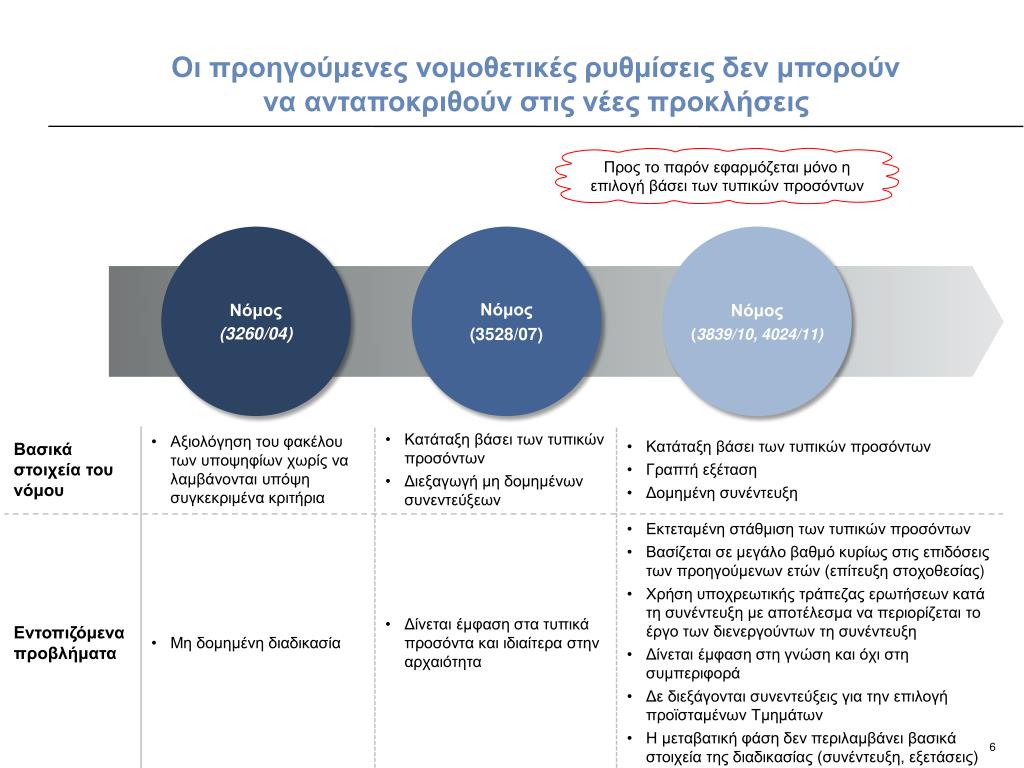 Οι προηγούμενες νομοθετικές ρυθμίσεις δεν μπορούν να ανταποκριθούν στις νέες προκλήσεις Νόμος (3260/04) • Νόμος • (3528/07) • Νόμος • (3839/10, 4024/11) Προς το παρόν εφαρμόζεται μόνο η επιλογή βάσει των τυπικών προσόντων