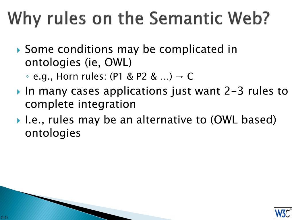 Why rules on the Semantic Web? • Some conditions may be complicated in ontologies (ie, OWL) • e.g., Horn rules: (P1 & P2 & …) → C • In many cases applications just want 2-3 rules to complete integration • I.e., rules may be an alternative to (OWL based) ontologies
