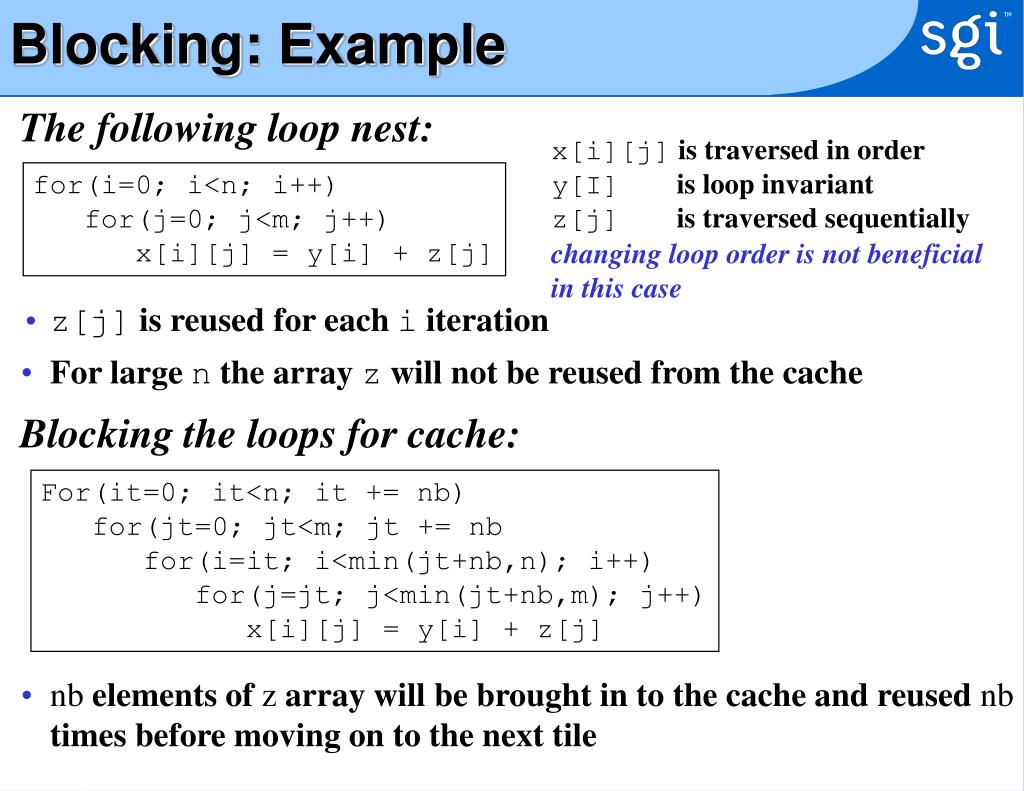 Blocking: Example • The following loop nest: • z[j] is reused for each i iteration • For large n the array z will not be reused from the cache • Blocking the loops for cache: • nb elements of z array will be brought in to the cache and reused nb times before moving on to the next tile x[i][j] is traversed in order y[I] is loop invariant z[j] is traversed sequentially changing loop order is not beneficial in this case for(i=0; i<n; i++) for(j=0; j<m; j++) x[i][j] = y[i] + z[j] For(it=0; it<n; it += nb) for(jt=0; jt<m; jt += nb for(i=it; i<min(jt+nb,n); i++) for(j=jt; j<min(jt+nb,m); j++) x[i][j] = y[i] + z[j]