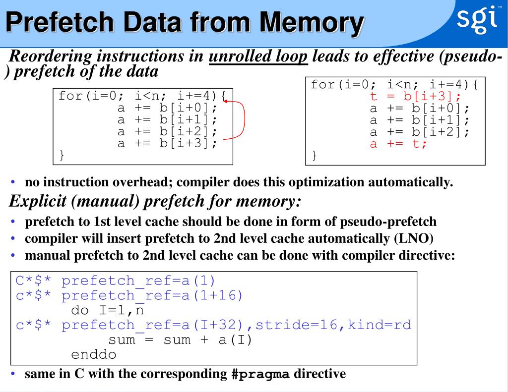 Prefetch Data from Memory for(i=0; i<n; i+=4){ a += b[i+0]; a += b[i+1]; a += b[i+2]; a += b[i+3]; } • Reordering instructions in unrolled loop leads to effective (pseudo-) prefetch of the data • no instruction overhead; compiler does this optimization automatically. • Explicit (manual) prefetch for memory: • prefetch to 1st level cache should be done in form of pseudo-prefetch • compiler will insert prefetch to 2nd level cache automatically (LNO) • manual prefetch to 2nd level cache can be done with compiler directive: • same in C with the corresponding #pragma directive for(i=0; i<n; i+=4){ t = b[i+3]; a += b[i+0]; a += b[i+1]; a += b[i+2]; a += t; } C*$* prefetch_ref=a(1) c*$* prefetch_ref=a(1+16) do I=1,n c*$* prefetch_ref=a(I+32),stride=16,kind=rd sum = sum + a(I) enddo