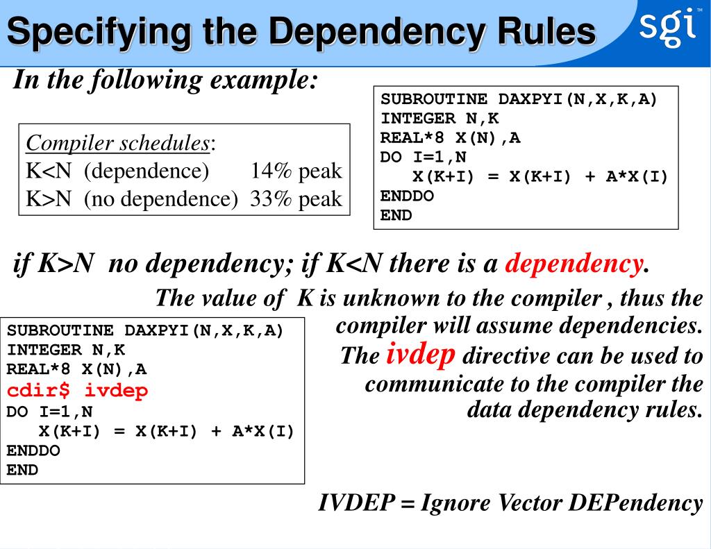 Three Types of IVDEP Directive • The IVDEP directive to the compiler is not part of any language and its interpretation is not standardized. • Default interpretation: • A and B and C are independent, that breaks both, lexically forward (i+k) and backward (i-k) dependencies. • index(1,i) != index(1,j) • index(2,i) != index(2,j) • But for some I: index(1,*) == index(2,*) • The default interpretation can be changed with the -OPT: compiler option. Possible other interpretations: • break only lexically backward dependencies (Cray IVDEP), I.e. assume only index(*,i)!=index(*,i-k) (cray_ivdep=on) • there are no dependencies what so ever (Liberal IVDEP, enable with -OPT:liberal_ivdep=on) CDIR$ IVDEP DO I=1,N A(INDEX(1,I)) = B(I) A(INDEX(2,I)) = C(I) ENDDO SGI default behaviour: A and B and C are independent, i.e. index(*,i) != index(*,j)