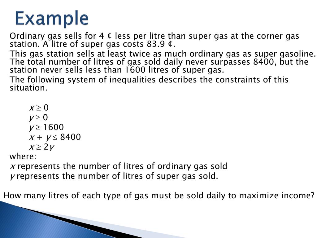 Example Ordinary gas sells for 4 ¢ less per litre than super gas at the corner gas station. A litre of super gas costs 83.9 ¢. This gas station sells at least twice as much ordinary gas as super gasoline. The total number of litres of gas sold daily never surpasses 8400, but the station never sells less than 1600 litres of super gas. The following system of inequalities describes the constraints of this situation. x 0 y 0 y 1600 x + y 8400 x 2y where: x represents the number of litres of ordinary gas sold y represents the number of litres of super gas sold. How many litres of each type of gas must be sold daily to maximize income?