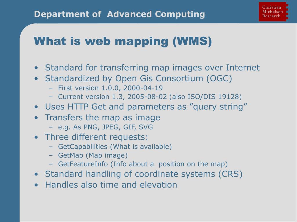 What is web mapping (WMS) • Standard for transferring map images over Internet • Standardized by Open Gis Consortium (OGC) • First version 1.0.0, 2000-04-19 • Current version 1.3, 2005-08-02 (also ISO/DIS 19128) • Uses HTTP Get and parameters as ”query string” • Transfers the map as image • e.g. As PNG, JPEG, GIF, SVG • Three different requests: • GetCapabilities (What is available) • GetMap (Map image) • GetFeatureInfo (Info about a position on the map) • Standard handling of coordinate systems (CRS) • Handles also time and elevation