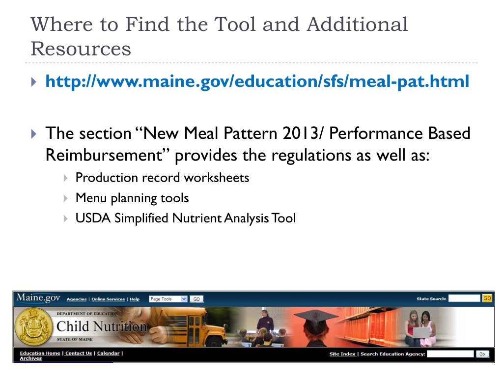 Where to Find the Tool and Additional Resources • http://www.maine.gov/education/sfs/meal-pat.html • The section “New Meal Pattern 2013/ Performance Based Reimbursement” provides the regulations as well as: • Production record worksheets • Menu planning tools • USDA Simplified Nutrient Analysis Tool