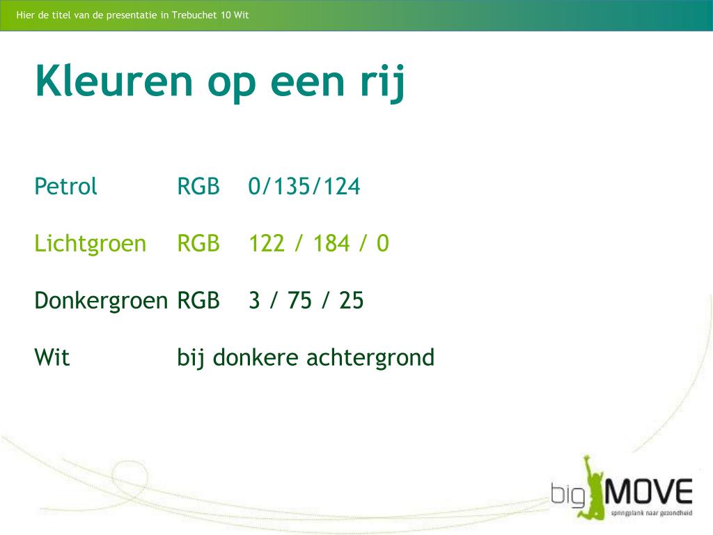 Hier de titel van de presentatie in Trebuchet 10 Wit Kleuren op een rij Petrol RGB 0/135/124 Lichtgroen RGB 122 / 184 / 0 Donkergroen RGB 3 / 75 / 25 Wit bij donkere achtergrond