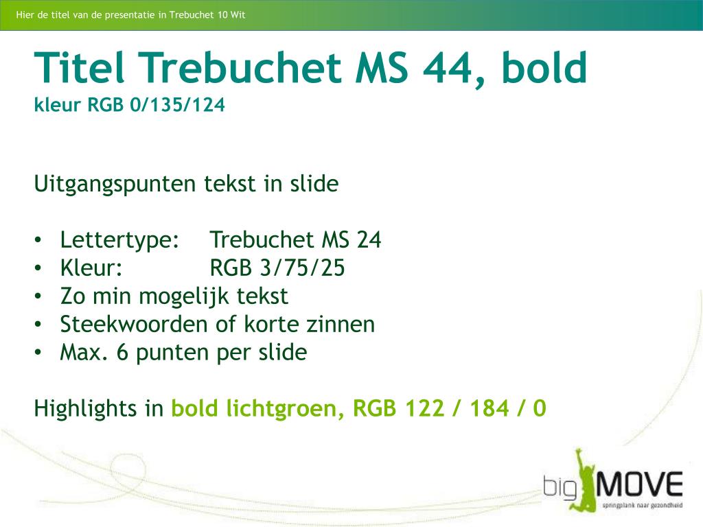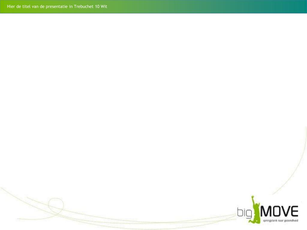 Hier de titel van de presentatie in Trebuchet 10 Wit Titel Trebuchet MS 44, bold kleur RGB 0/135/124 • Uitgangspunten tekst in slide • Lettertype: Trebuchet MS 24 • Kleur: RGB 3/75/25 • Zo min mogelijk tekst • Steekwoorden of korte zinnen • Max. 6 punten per slide • Highlights in boldlichtgroen, RGB 122 / 184 / 0