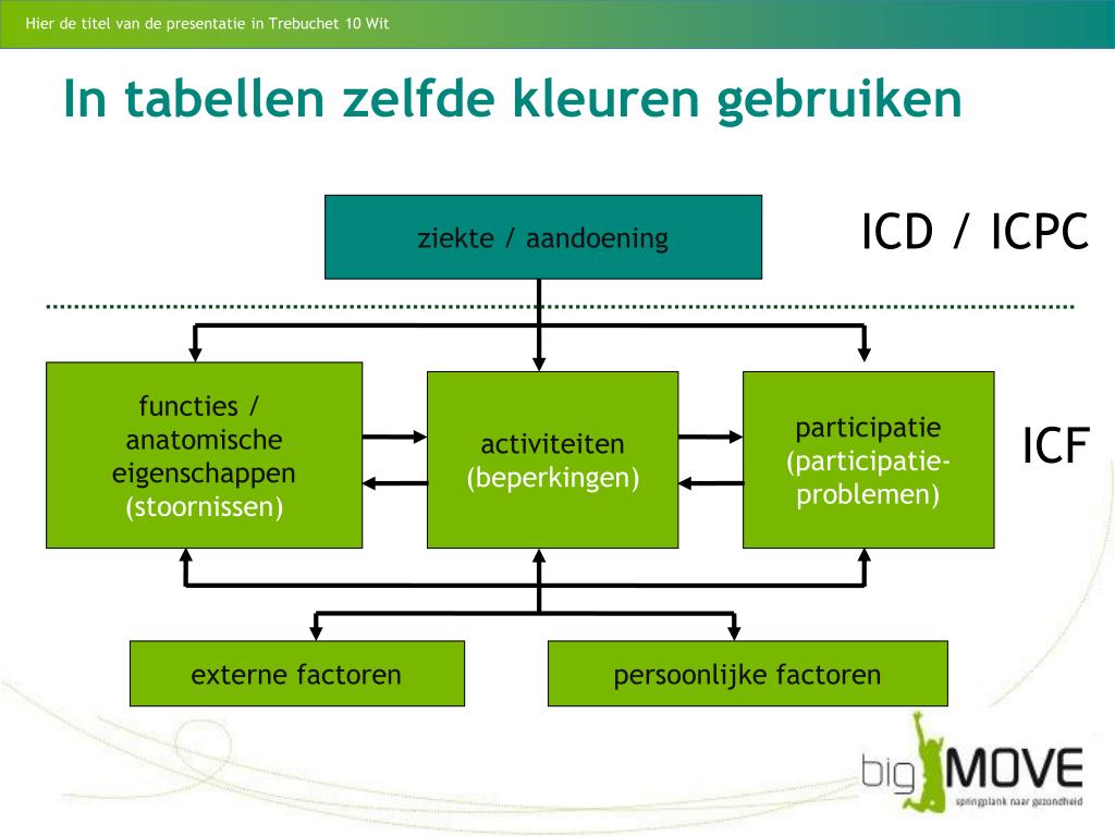 ziekte / aandoening functies / anatomische eigenschappen (stoornissen) participatie (participatie- problemen) activiteiten (beperkingen) externe factoren persoonlijke factoren Hier de titel van de presentatie in Trebuchet 10 Wit In tabellen zelfde kleuren gebruiken ICD / ICPC ICF