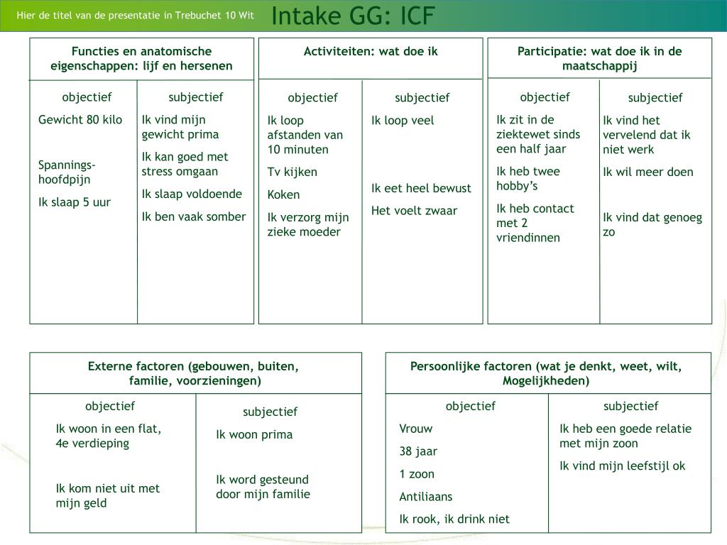 Intake GG: ICF Functies en anatomische eigenschappen: lijf en hersenen Activiteiten: wat doe ik Participatie: wat doe ik in de maatschappij objectief Gewicht 80 kilo Spannings-hoofdpijn Ik slaap 5 uur subjectief Ik vind mijn gewicht prima Ik kan goed met stress omgaan Ik slaap voldoende Ik ben vaak somber objectief Ik zit in de ziektewet sinds een half jaar Ik heb twee hobby’s Ik heb contact met 2 vriendinnen objectief Ik loop afstanden van 10 minuten Tv kijken Koken Ik verzorg mijn zieke moeder subjectief Ik loop veel Ik eet heel bewust Het voelt zwaar subjectief Ik vind het vervelend dat ik niet werk Ik wil meer doen Ik vind dat genoeg zo Externe factoren (gebouwen, buiten, familie, voorzieningen) Persoonlijkefactoren (wat je denkt, weet, wilt, Mogelijkheden) objectief Ik woon in een flat, 4e verdieping Ik kom niet uit met mijn geld objectief Vrouw 38 jaar 1 zoon Antiliaans Ik rook, ik drink niet subjectief Ik heb een goede relatie met mijn zoon Ik vind mijn leefstijl ok subjectief Ik woon prima Ik word gesteund door mijn familie Hier de titel van de presentatie in Trebuchet 10 Wit