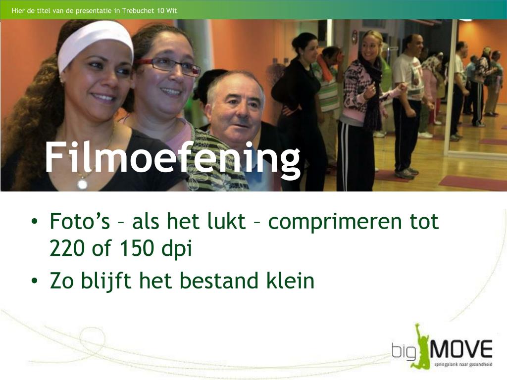 Hier de titel van de presentatie in Trebuchet 10 Wit • Foto’s – als het lukt – comprimeren tot 220 of 150 dpi • Zo blijft het bestand klein Filmoefening
