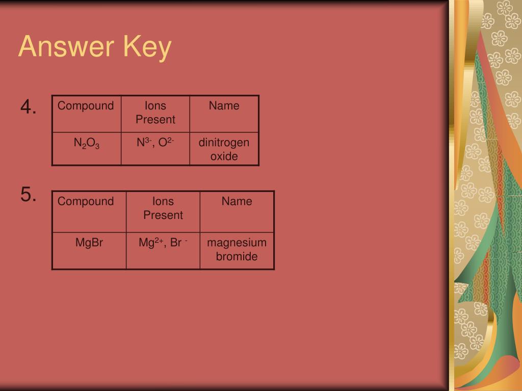 Answer Key • The metals lose ions to become a cation and the nonmetals gain ions to become an anion. 2. 3.