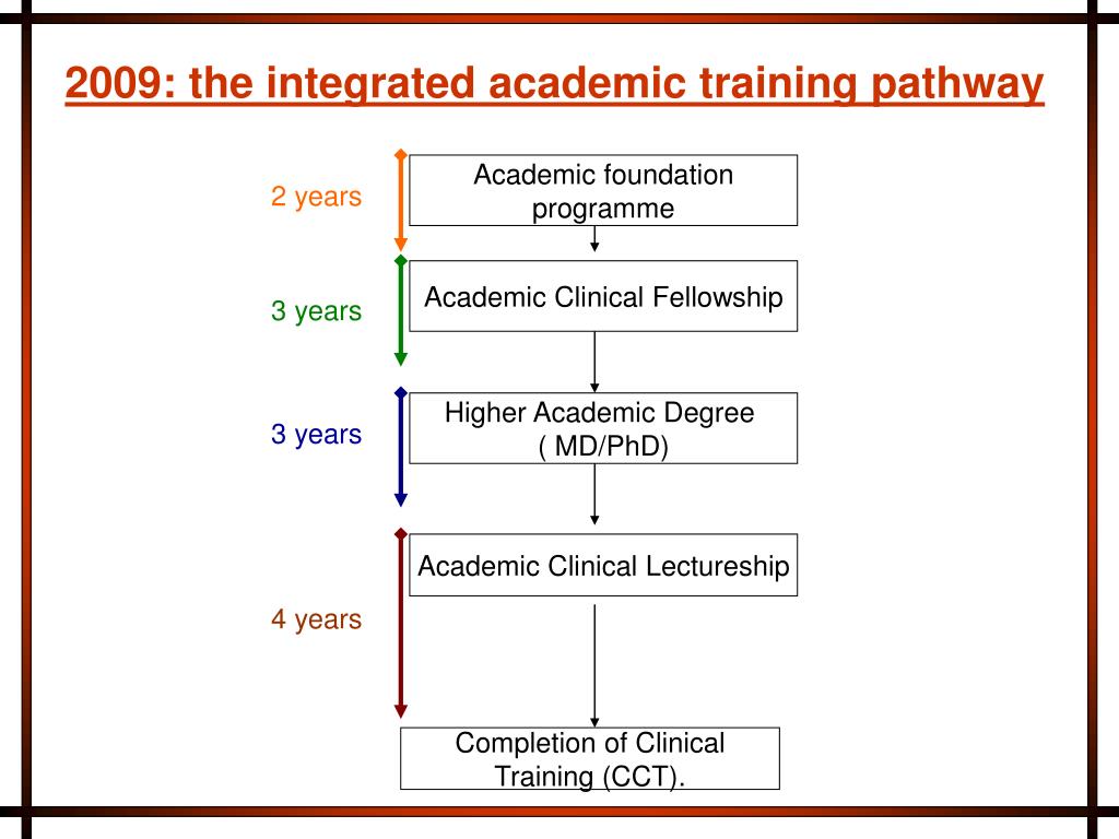 Academic foundation programme 2 years Academic Clinical Fellowship 3 years Higher Academic Degree ( MD/PhD) 3 years Academic Clinical Lectureship 4 years Completion of Clinical Training (CCT). 2009: the integrated academic training pathway