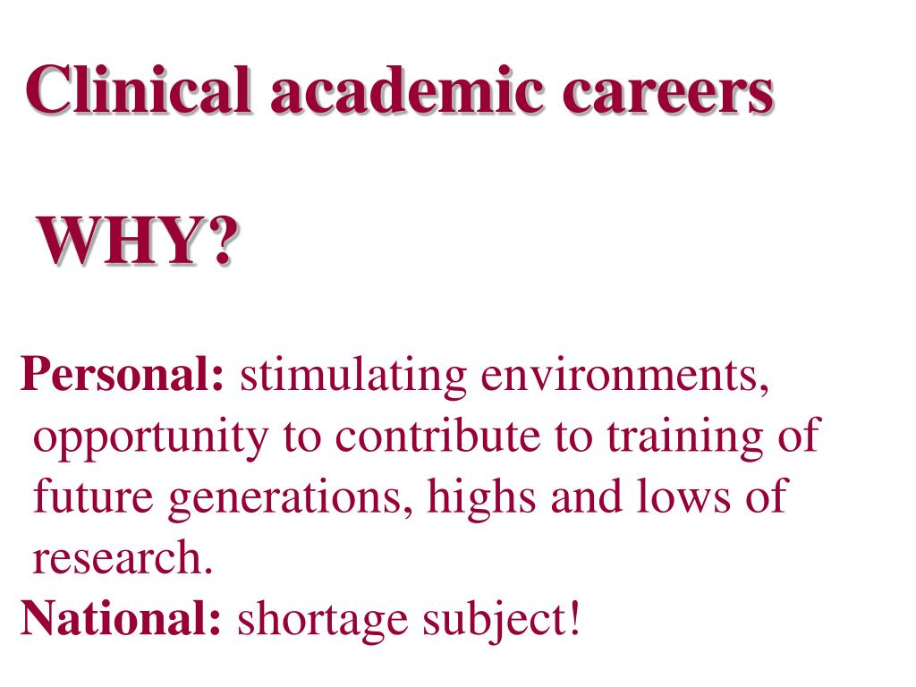 Clinical academic careers WHY? Personal: stimulating environments, opportunity to contribute to training of future generations, highs and lows of research. National: shortage subject!