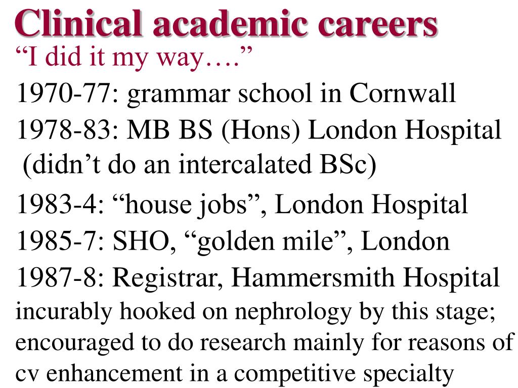 Clinical academic careers “I did it my way….” 1970-77: grammar school in Cornwall 1978-83: MB BS (Hons) London Hospital (didn’t do an intercalated BSc) 1983-4: “house jobs”, London Hospital 1985-7: SHO, “golden mile”, London 1987-8: Registrar, Hammersmith Hospital incurably hooked on nephrology by this stage; encouraged to do research mainly for reasons of cv enhancement in a competitive specialty