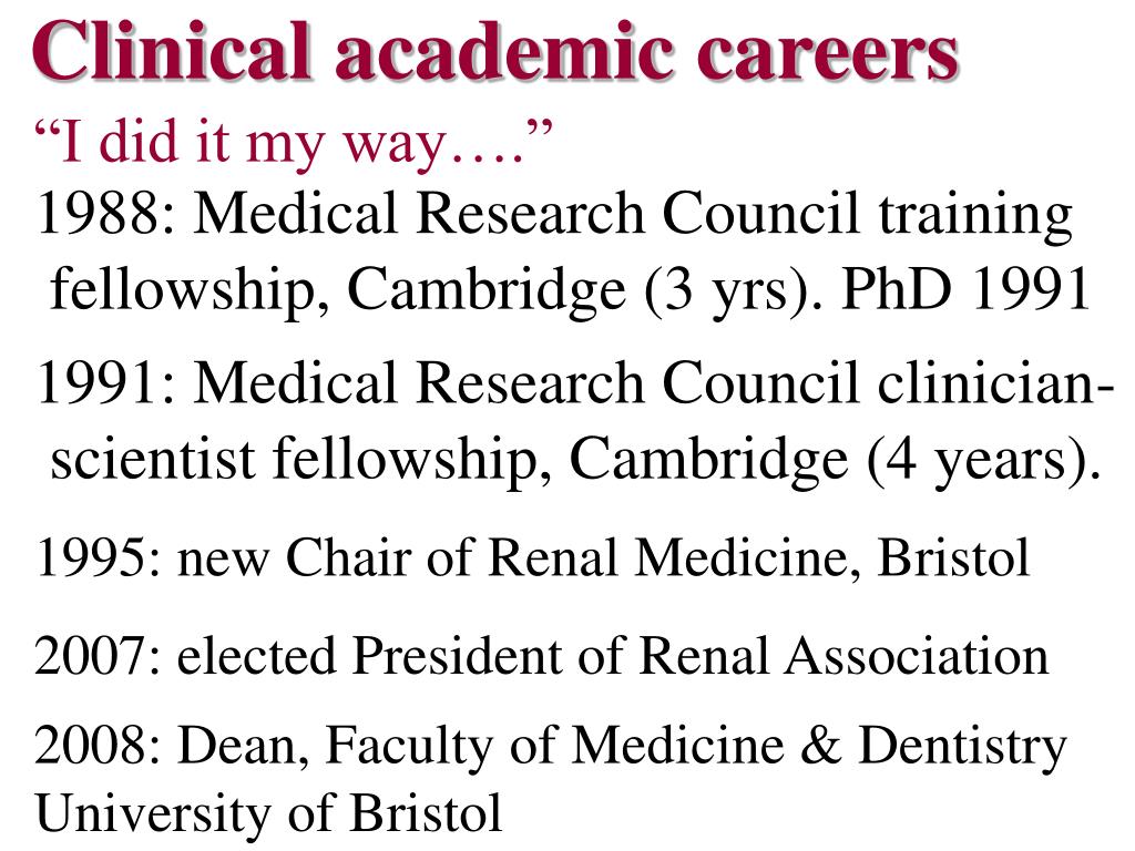 Clinical academic careers “I did it my way….” 1988: Medical Research Council training fellowship, Cambridge (3 yrs). PhD 1991 1991: Medical Research Council clinician- scientist fellowship, Cambridge (4 years). 1995: new Chair of Renal Medicine, Bristol 2007: elected President of Renal Association 2008: Dean, Faculty of Medicine & Dentistry University of Bristol