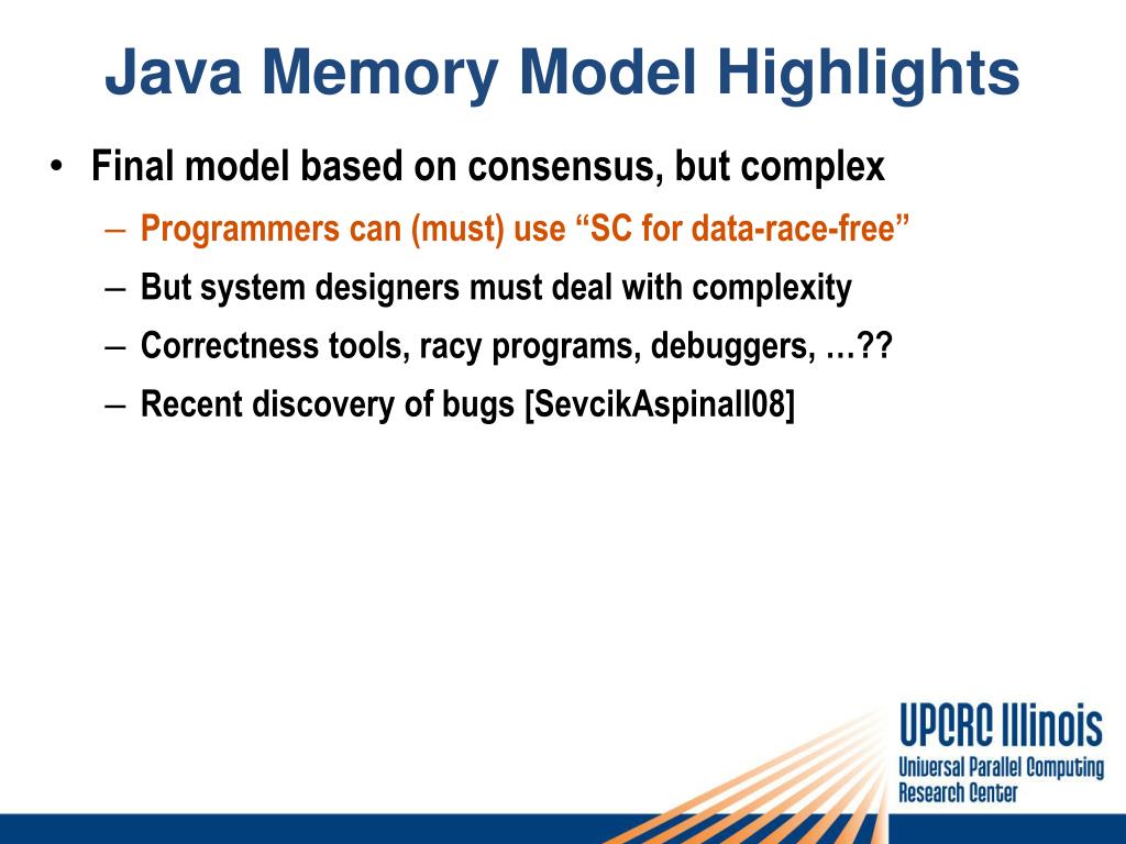 Java Memory Model Highlights • Final model based on consensus, but complex • Programmers can (must) use “SC for data-race-free” • But system designers must deal with complexity • Correctness tools, racy programs, debuggers, …?? • Recent discovery of bugs [SevcikAspinall08]