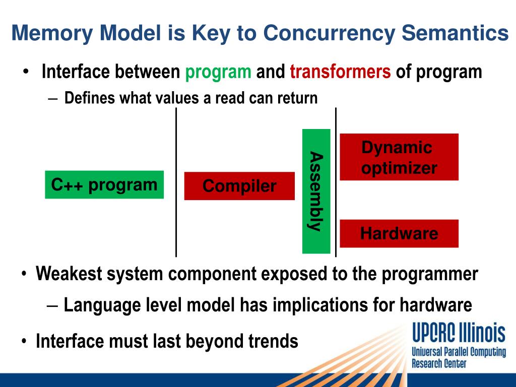 Memory Model is Key to Concurrency Semantics • Interface between program and transformersof program • Defines what values a read can return Dynamic optimizer C++ program Compiler Assembly Hardware • Weakest system component exposed to the programmer • Language level model has implications for hardware • Interface must last beyond trends