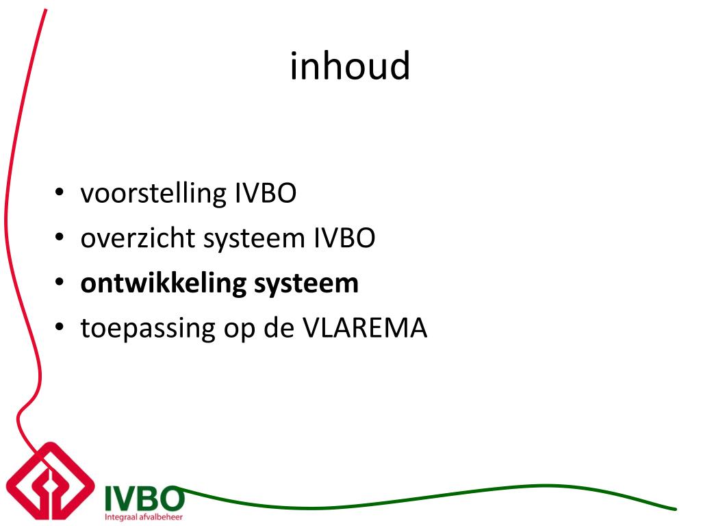inhoud • voorstelling IVBO • overzicht systeem IVBO • ontwikkeling systeem • toepassing op de VLAREMA