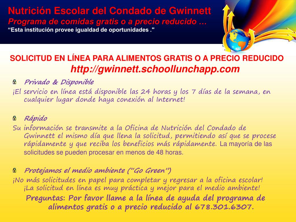 Nutrición Escolar del Condado de Gwinnett Programa de comidas gratis o a precio reducido …“Esta institución provee igualdad de oportunidades ." SOLICITUD EN LÍNEA PARA ALIMENTOS GRATIS O A PRECIO REDUCIDO http://gwinnett.schoollunchapp.com • Privado & Disponible ¡El servicio en línea está disponible las 24 horas y los 7 días de la semana, en cualquier lugar donde haya conexión al Internet! • Rápido Su información se transmite a la Oficina de Nutrición del Condado de Gwinnett el mismo día que llena la solicitud, permitiendo así que se procese rápidamente y que reciba los beneficios más rápidamente. La mayoría de las solicitudes se pueden procesar en menos de 48 horas. • Protejamos el medio ambiente (“Go Green”) ¡No más solicitudes en papel para completar y regresar a la oficina escolar! ¡La solicitud en línea es muy práctica y mejor para el medio ambiente! Preguntas: Por favor llame a la línea de ayuda del programa de alimentos gratis o a precio reducido al 678.301.6307.