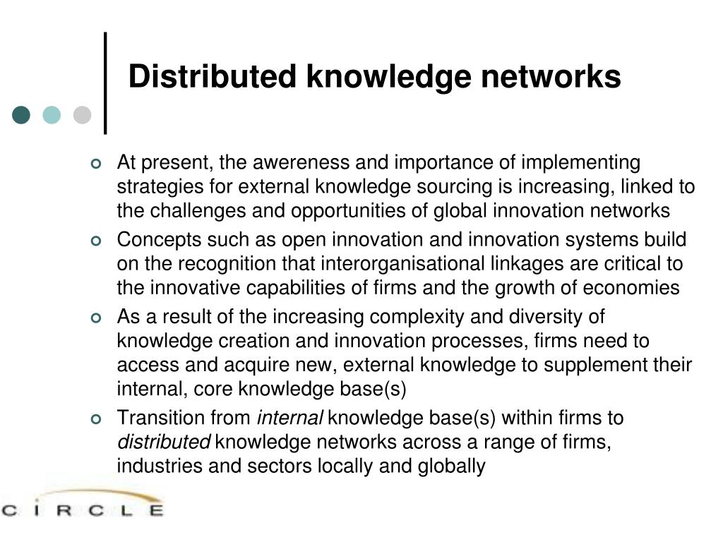 Distributed knowledge networks • At present, the awereness and importance of implementing strategies for external knowledge sourcing is increasing, linked to the challenges and opportunities of global innovation networks • Concepts such as open innovation and innovation systems build on the recognition that interorganisational linkages are critical to the innovative capabilities of firms and the growth of economies • As a result of the increasing complexity and diversity of knowledge creation and innovation processes, firms need to access and acquire new, external knowledge to supplement their internal, core knowledge base(s) • Transition from internal knowledge base(s) within firms to distributed knowledge networks across a range of firms, industries and sectors locally and globally