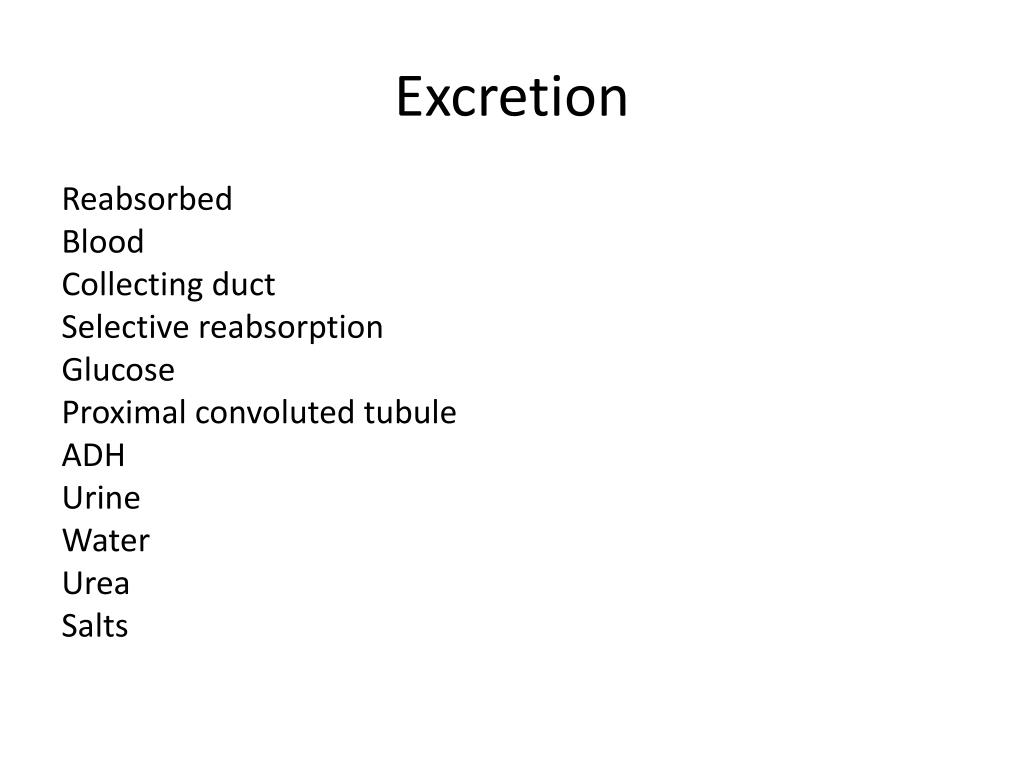 Excretion Reabsorbed Blood Collecting duct Selective reabsorption Glucose Proximal convoluted tubule ADH Urine Water Urea Salts