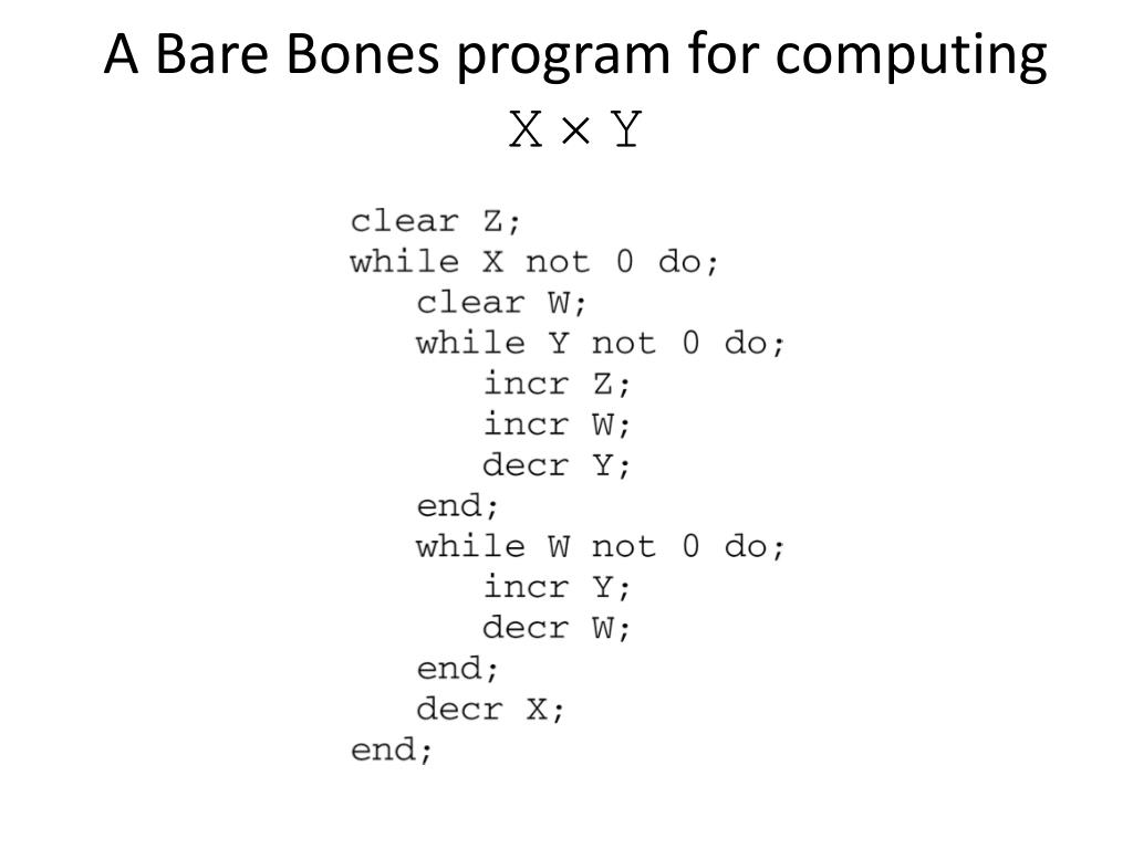 The Bare Bones Language • Bare Bones is a simple, yet universal language. • Statements • clear name; • incr name; • decr name; • while name not 0 do; … end;