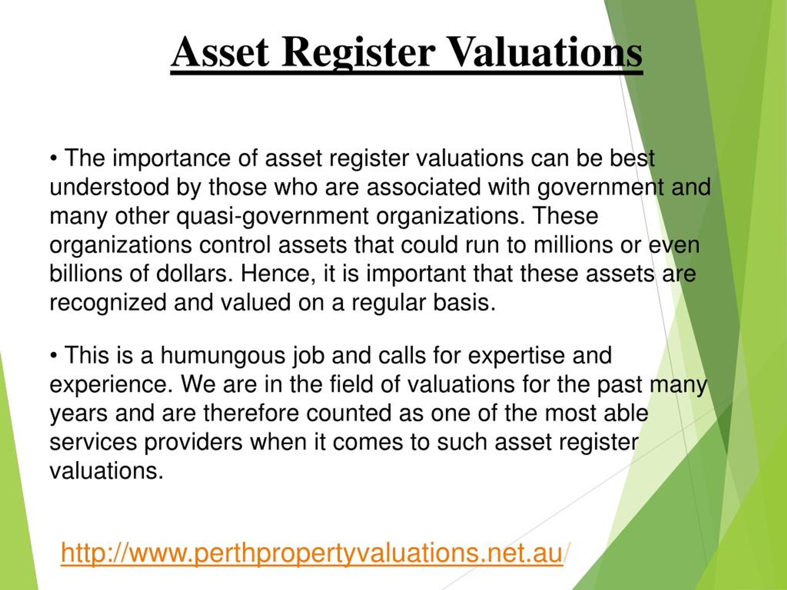 Asset Register Valuations • The importance of asset register valuations can be best understood by those who are associated with government and many other quasi-government organizations. These organizations control assets that could run to millions or even billions of dollars. Hence, it is important that these assets are recognized and valued on a regular basis. • This is a humungous job and calls for expertise and experience. We are in the field of valuations for the past many years and are therefore counted as one of the most able services providers when it comes to such asset register valuations. http://www.perthpropertyvaluations.net.au/