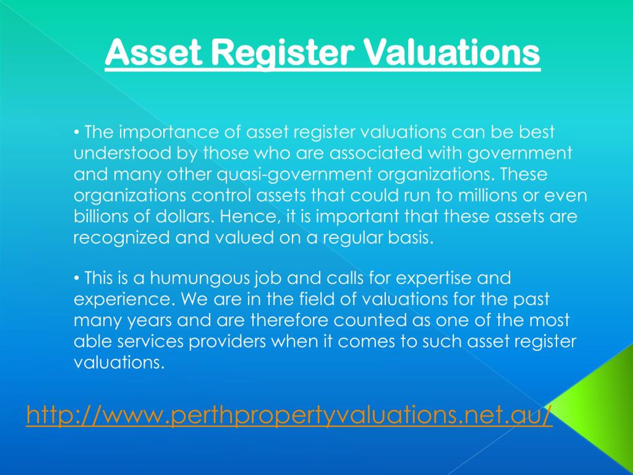 Asset Register Valuations • The importance of asset register valuations can be best understood by those who are associated with government and many other quasi-government organizations. These organizations control assets that could run to millions or even billions of dollars. Hence, it is important that these assets are recognized and valued on a regular basis. • This is a humungous job and calls for expertise and experience. We are in the field of valuations for the past many years and are therefore counted as one of the most able services providers when it comes to such asset register valuations. http://www.perthpropertyvaluations.net.au/