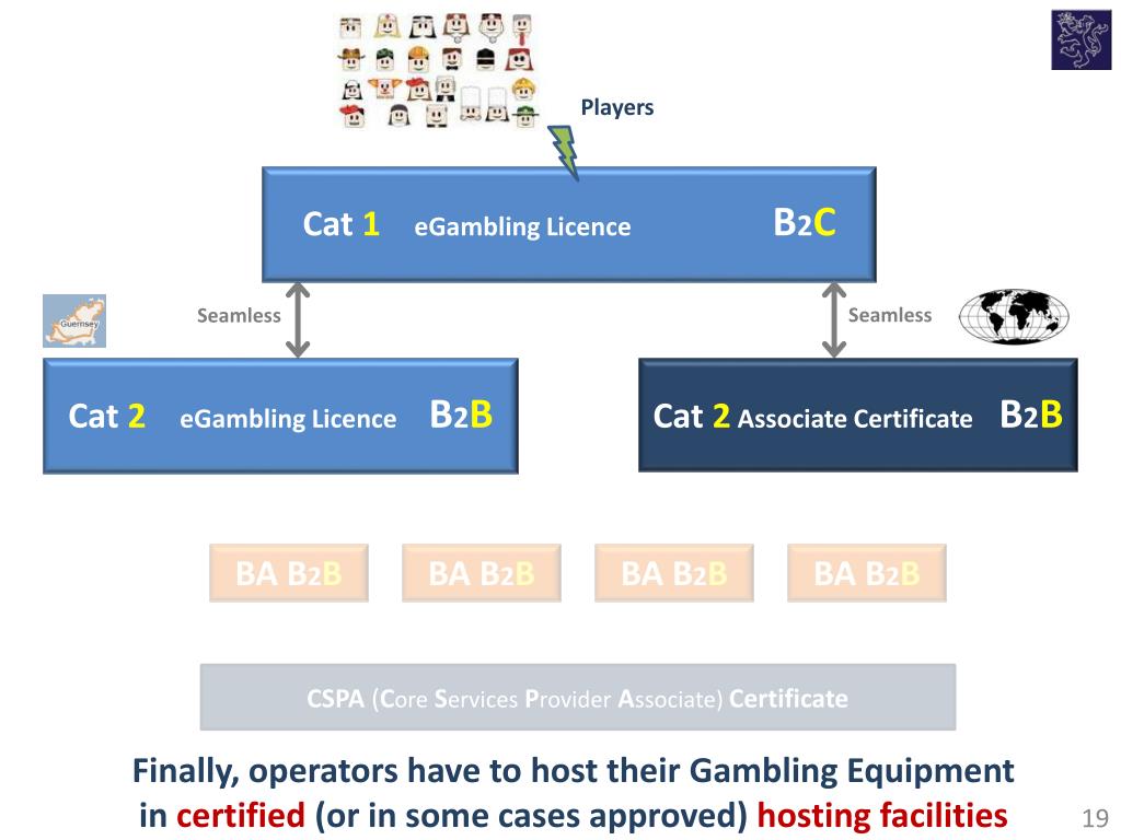 Players Cat 1eGambling Licence B2C Seamless Seamless Cat 2eGambling Licence B2B Cat 2 Associate CertificateB2B BA B2B BA B2B BA B2B BA B2B CSPA (Core Services Provider Associate) Certificate Finally, operators have to host their Gambling Equipment in certified (or in some cases approved) hosting facilities