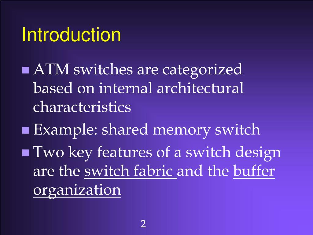 Introduction • ATM switches are categorized based on internal architectural characteristics • Example: shared memory switch • Two key features of a switch design are the switch fabric and the buffer organization