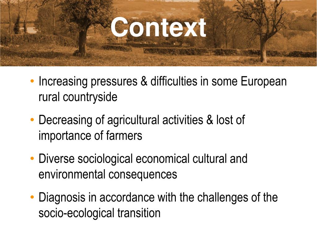Context • Increasing pressures & difficulties in some European rural countryside • Decreasing of agricultural activities & lost of importance of farmers • Diverse sociological economical cultural and environmental consequences • Diagnosis in accordance with the challenges of the socio-ecological transition