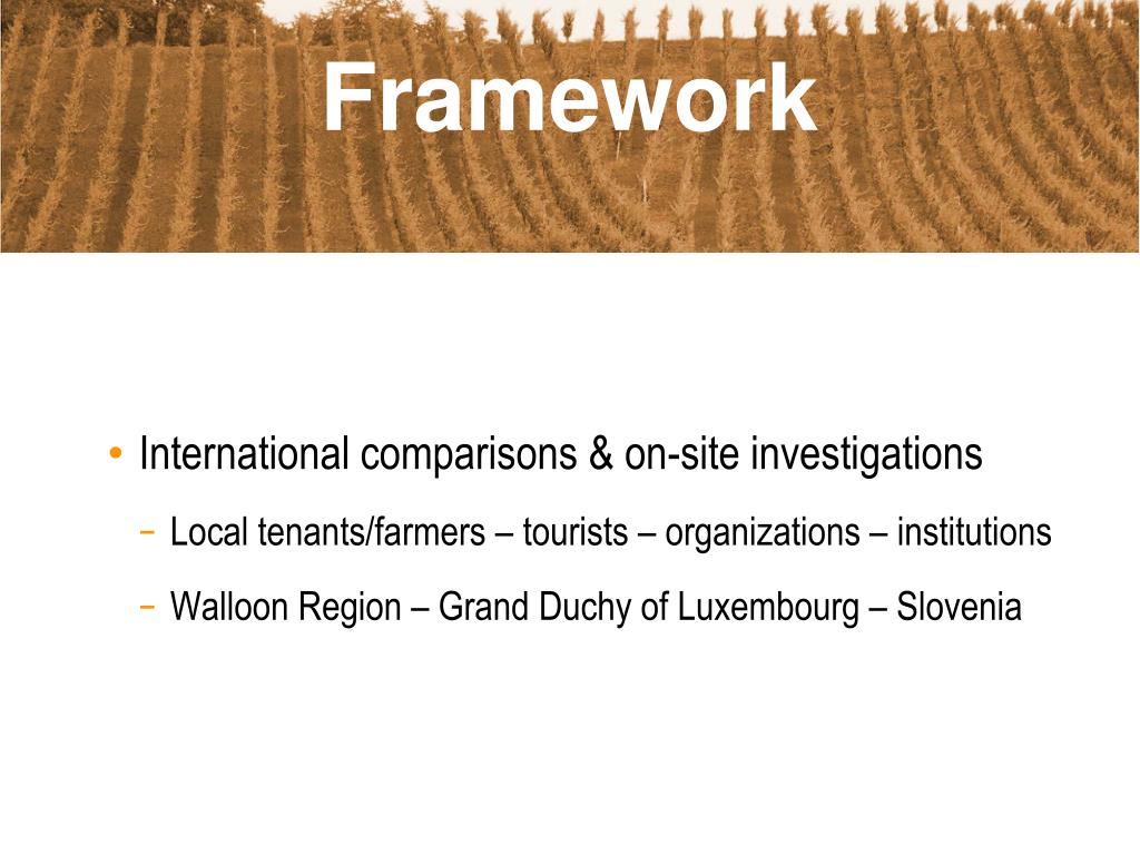 Framework • International comparisons & on-site investigations • Local tenants/farmers – tourists – organizations – institutions • Walloon Region – Grand Duchy of Luxembourg – Slovenia