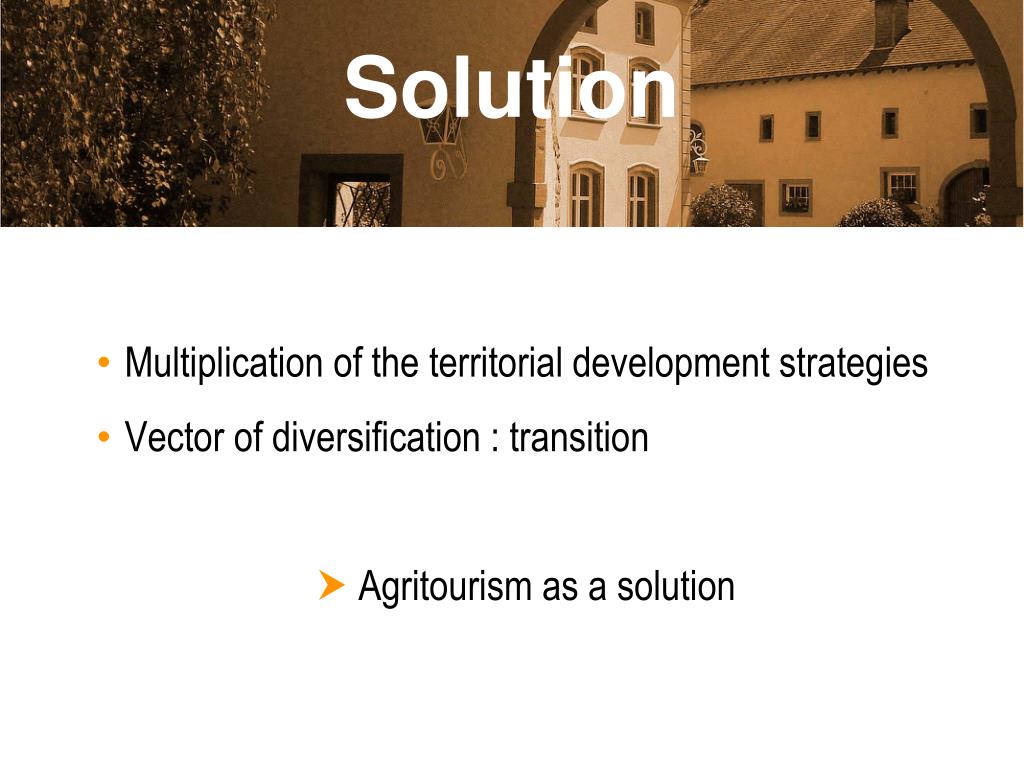 Solution • Multiplication of the territorial development strategies • Vector of diversification : transition Agritourism as a solution